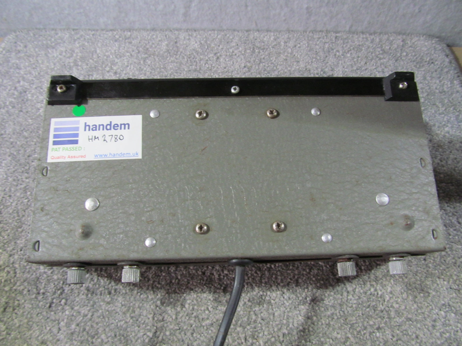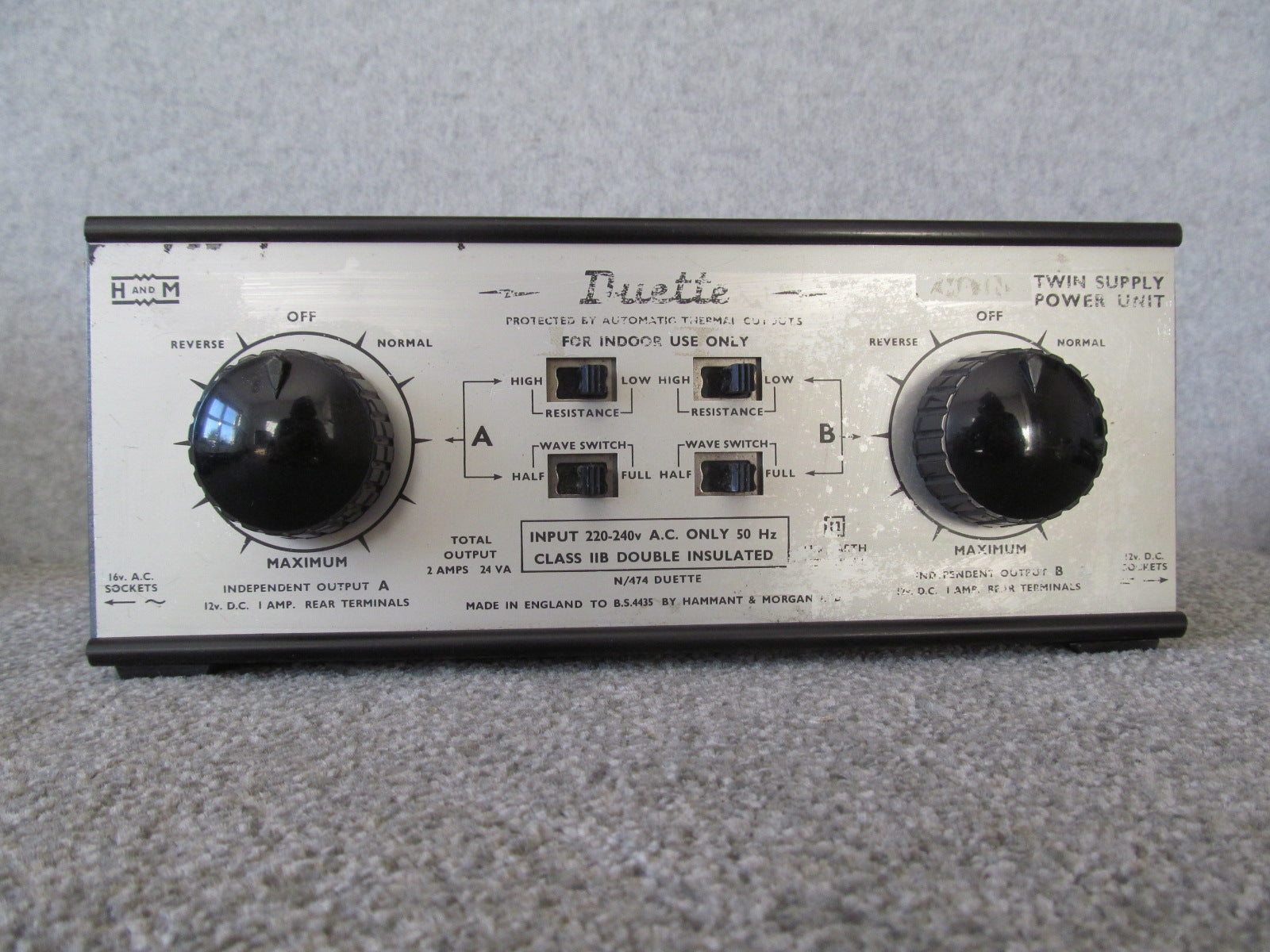 A two track model railway controller with additional 16v AC and 12v DC outlets.