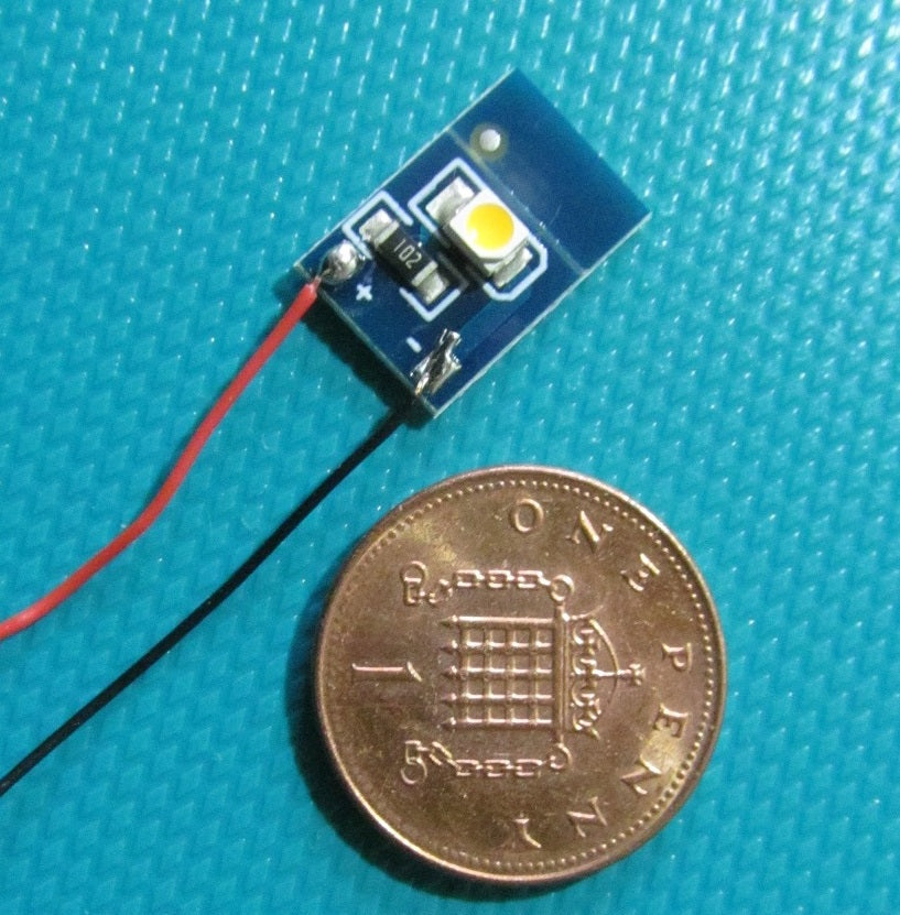 Tiny pcb with on-board LED, pre-wired.